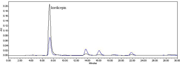 Izdelek Cordyvit® vsebuje zmleto gobo Cordyceps ter ne vsebuje sestavin živalskega izvora in je pridelan po smernicah ekološke pridelave, brez uporabe kemičnih pripravkov. Priporočamo ga športnikom in drugim aktivnim osebam po daljših fizičnih obremenitvah ter osebam, ki si želijo aktivnejšega udejstvovanja pri vsakodnevnih opravilih. Celoten izdelek Cordyvit® je izdelan v Evropski uniji po smernicah ekološke pridelave ter je primeren za vegetarijance in vegane. ![]() HPLC analiza farmakološko aktivne spojine kordicepin* nakazuje na veliko večjo aktivnost produkta Cordyvit® (črna črta) v primerjavi z umetno gojeno gobo Cordyceps (modra črta). *Analiza opravljena na Edible Fungi Institute, Shanghai Academy of Agricultural Sciences, Shanghai, Kitajska